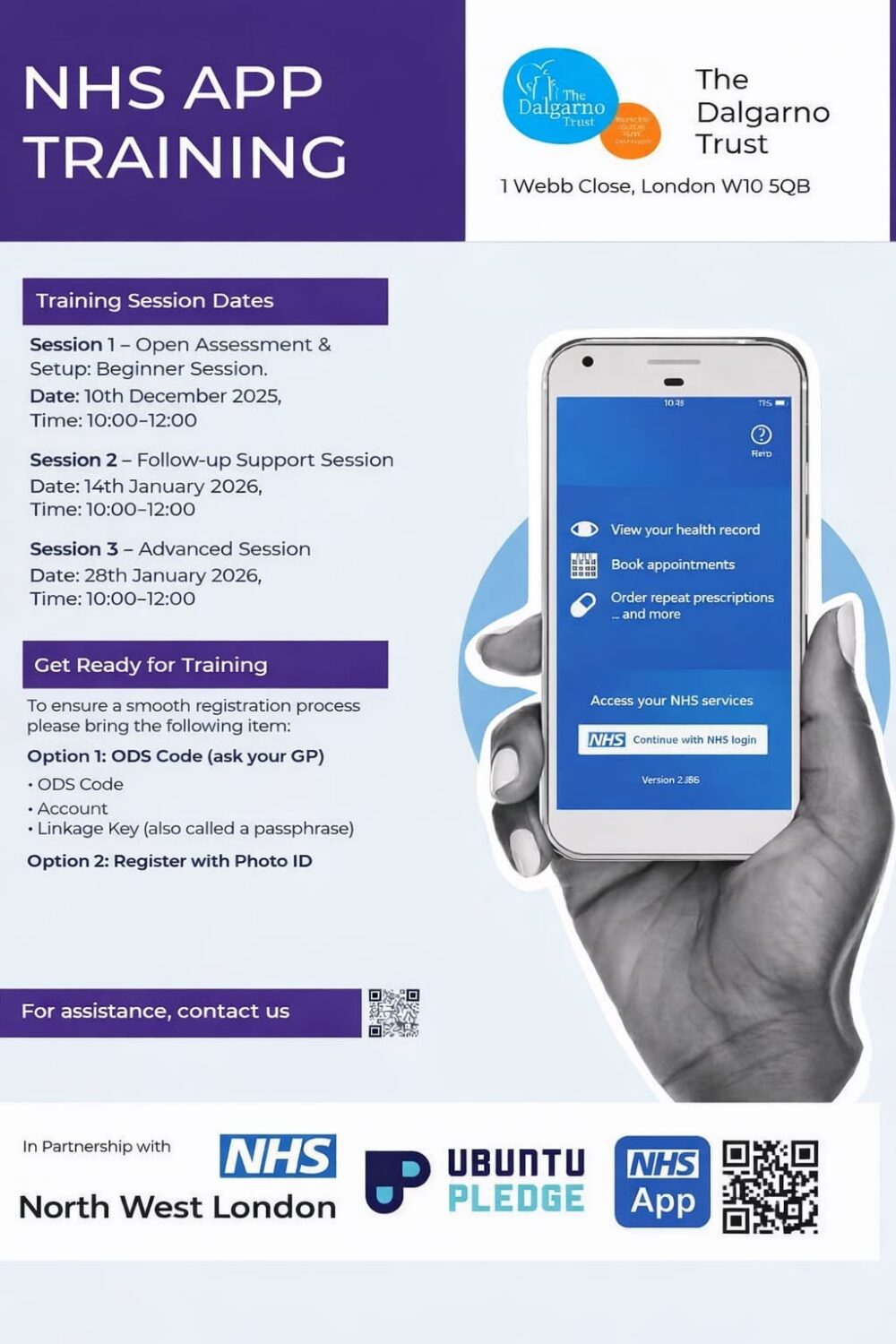 Join us on Wednesday 28 January, from 10am to 12pm at Dalgarno Trust for our last follow-up NHS App training session, delivered in partnership with @nwlondonics and @ubuntupledge 📲
